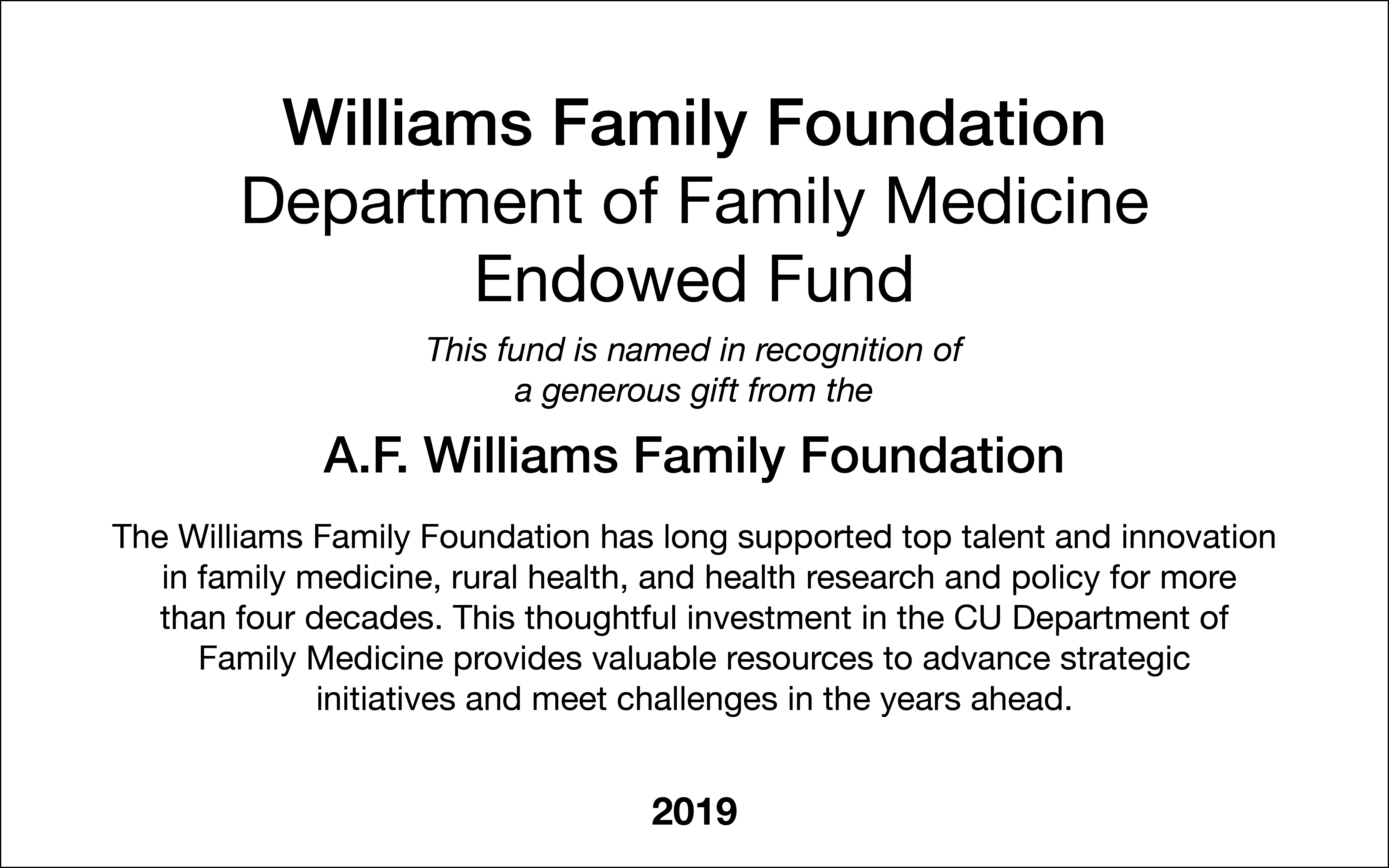 The Williams Family Foundation has long supported top talent and innovation in family medicine, rural health, and health research and policy for more than four decades. This thoughtful investment in the CU Department of Family Medicine provides valuable resources to advance strategic initiatives and meet challenges in the years ahead.