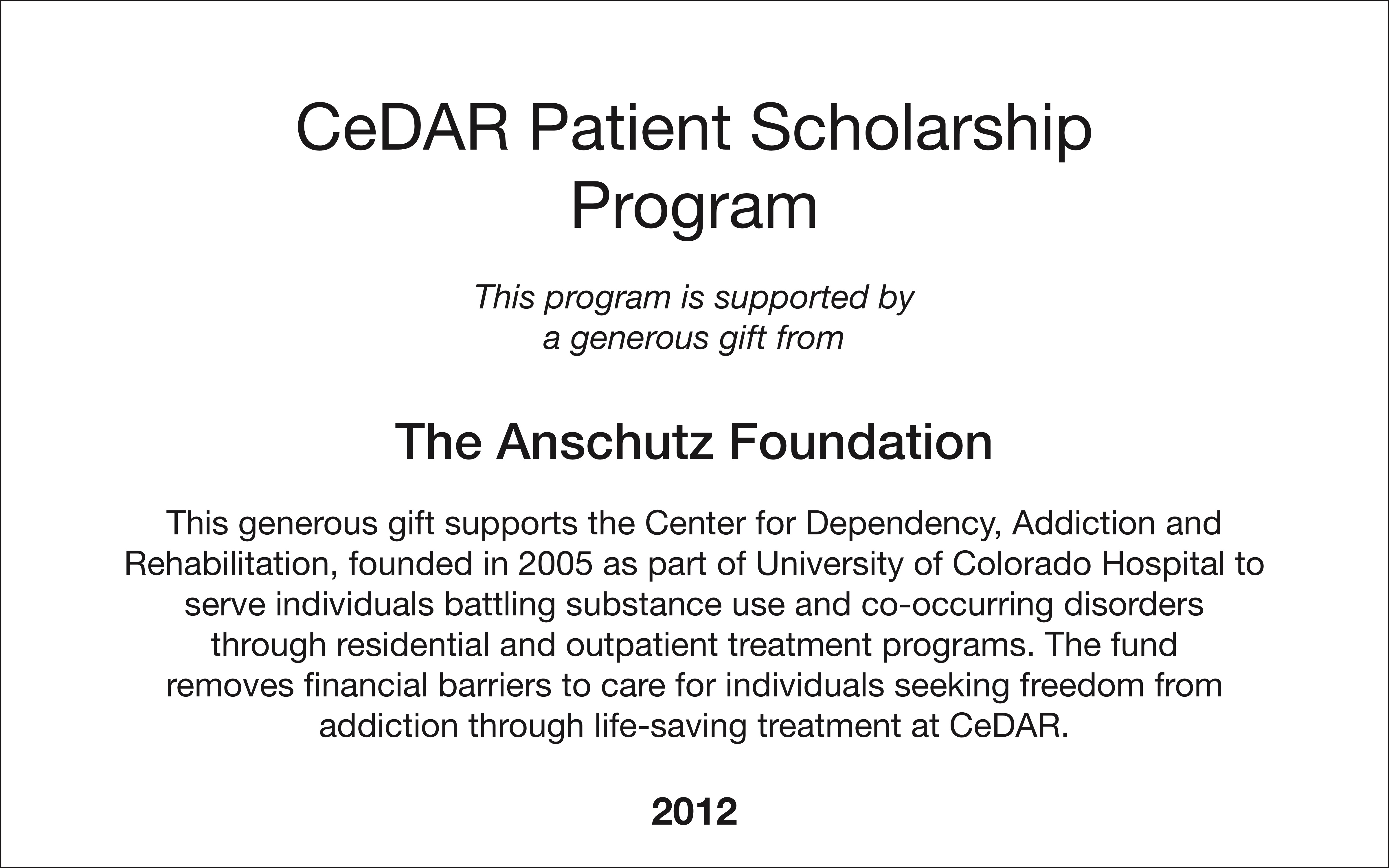 This generous gift supports the Center for Dependency, Addiction and Rehabilitation, founded in 2005 as part of University of Colorado Hospital to serve individuals battling substance use and co-occurring disorders through residential and outpatient treatment programs. The fund removes financial barriers to care for individuals seeking freedom from addiction through life-saving treatment at CeDAR.