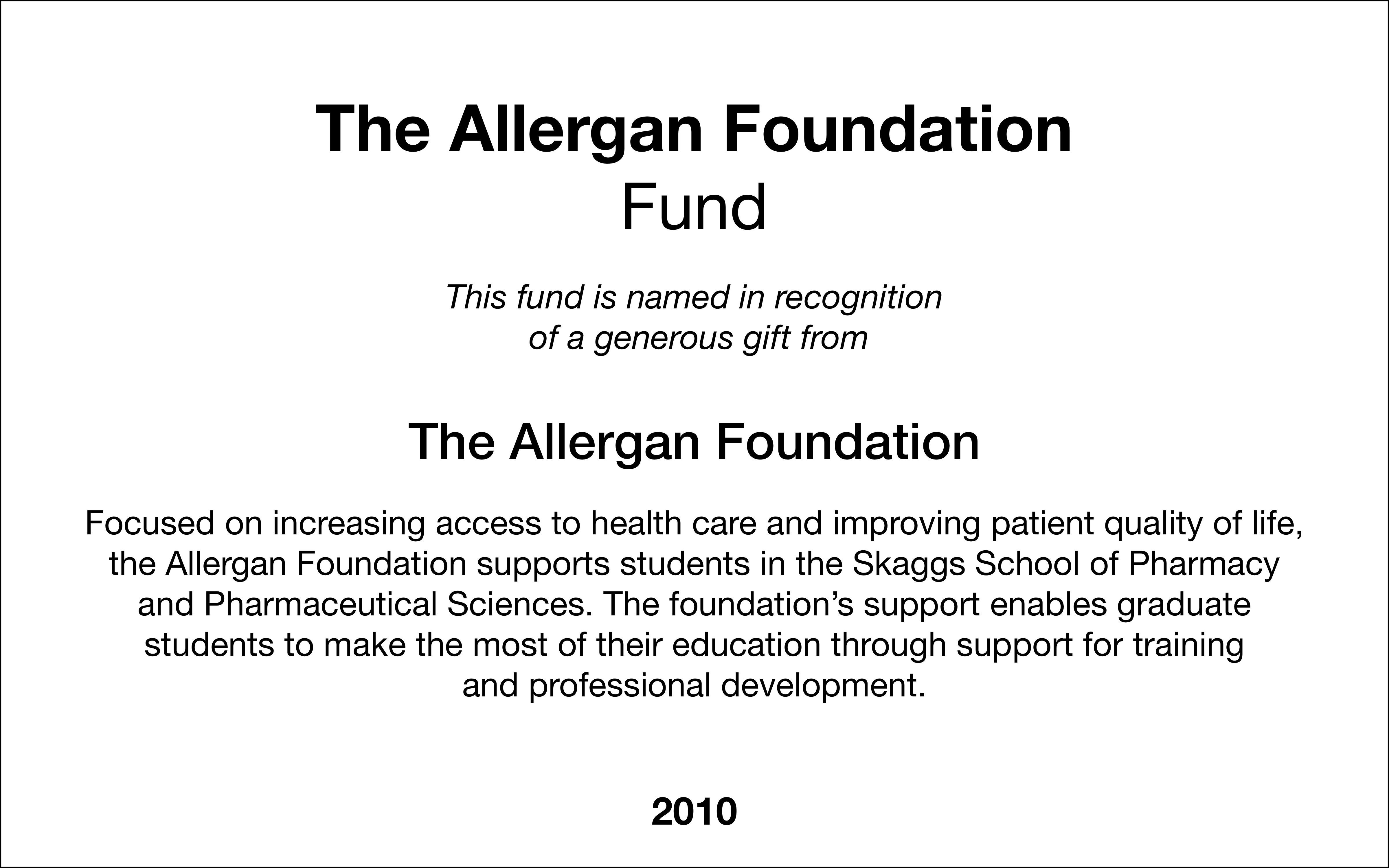 Focused on increasing access to health care and improving patient quality of life, the Allergan Foundation supports students in the Skaggs School of Pharmacy and Pharmaceutical Sciences. The foundation’s support enables graduate students to make the most of their education through support for training and professional development.